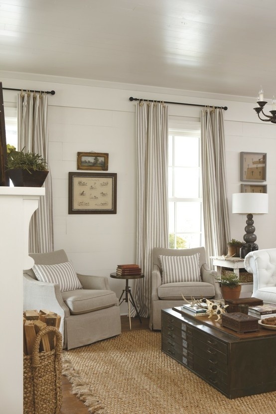 比如這張圖里地毯與茶幾顏色過于“大面積”所以都不適合作為窗簾顏色的參照色,但如果是和灰白條紋的沙發(fā)抱枕保持一致就毫不違和。而且也符合上文提到的比墻面顏色要深一點的準(zhǔn)則。