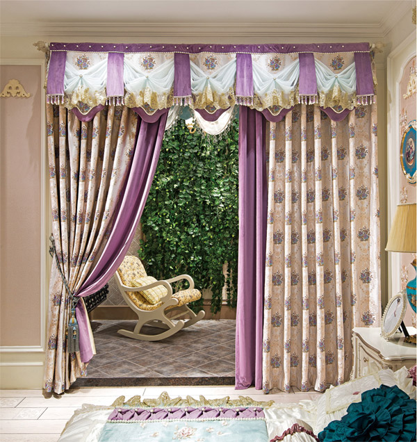 花型、色彩及款式:融合各種歐式花卉及卷草圖案。以金色調(diào)為主,酒紅、紫紅等為配色,搭配層次豐富的水波簾頭款式及歐式花邊進(jìn)行設(shè)計(jì)。(如:吊珠類花邊等)