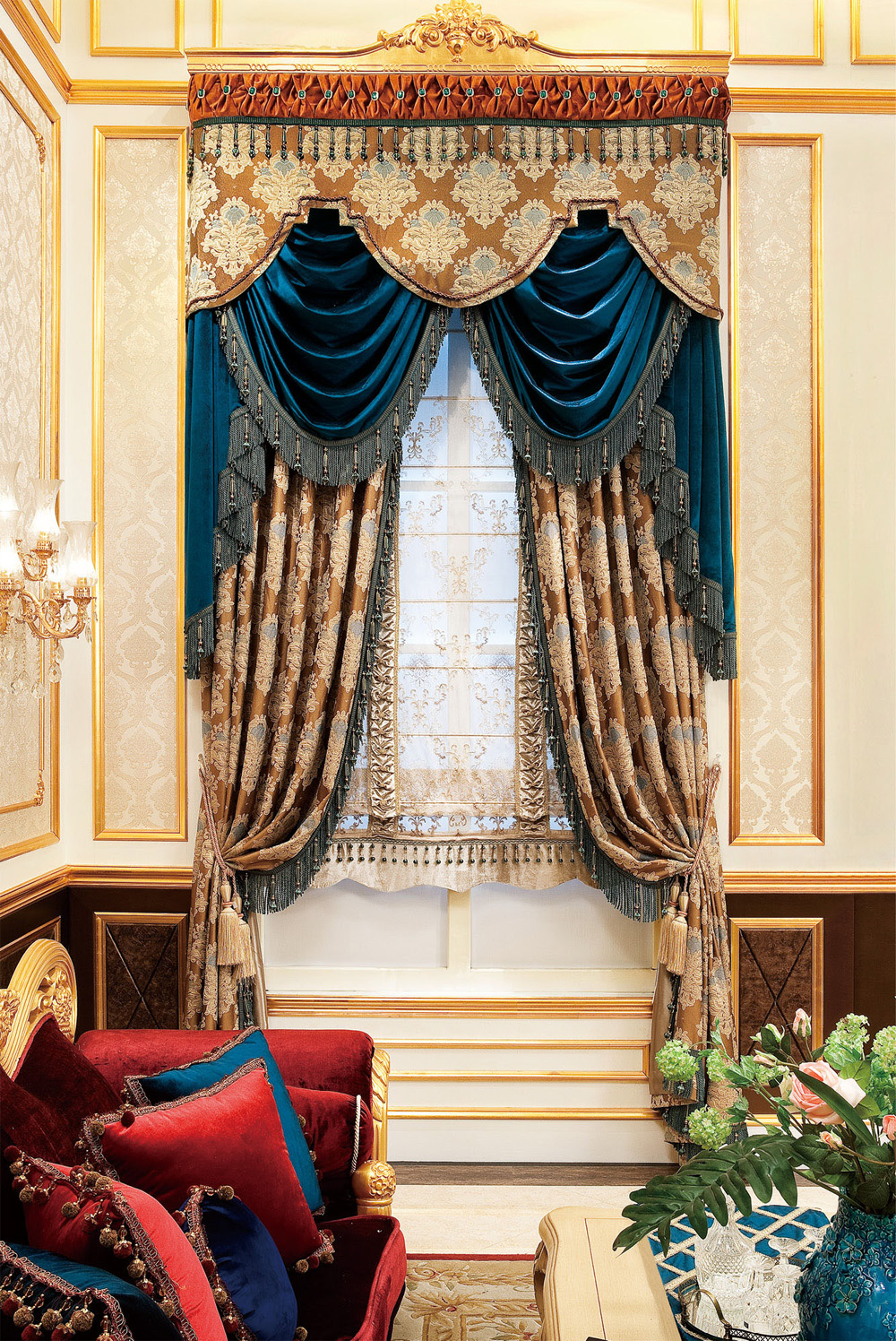 花型、色彩及款式:融合各種歐式花卉及卷草圖案。以金色調(diào)為主,酒紅、紫紅等為配色,搭配層次豐富的水波簾頭款式及歐式花邊進(jìn)行設(shè)計(jì)。(如:吊珠類花邊等)